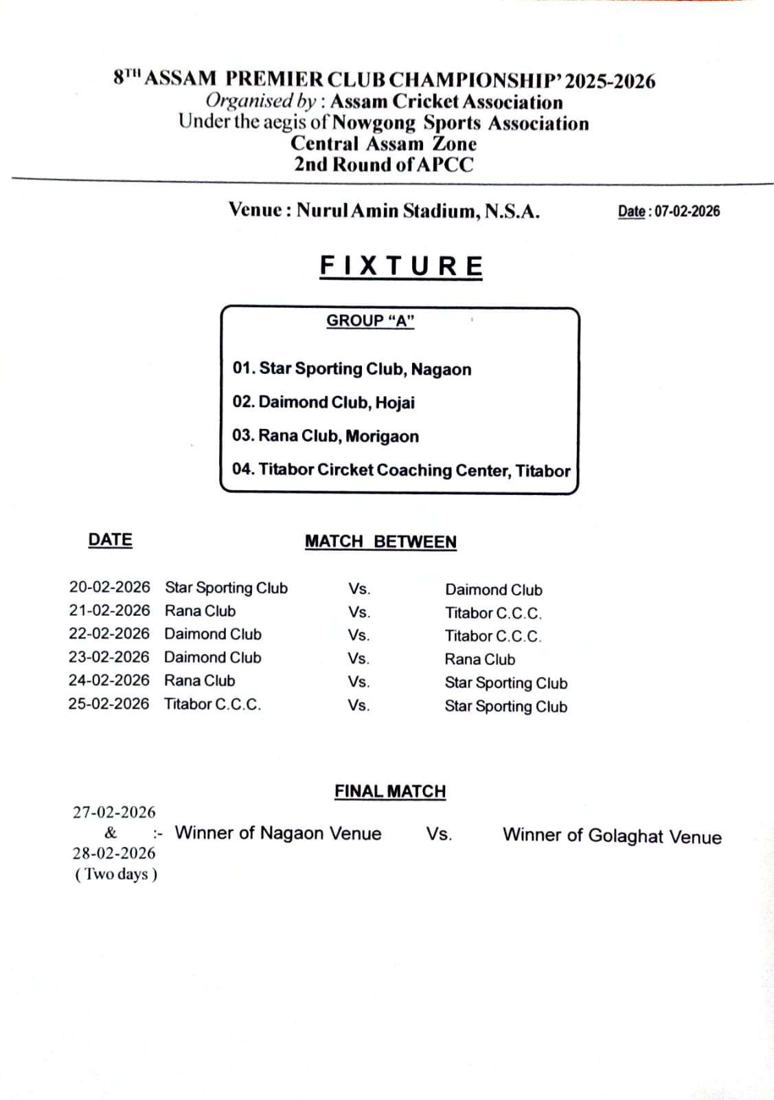8th Assam Premier Club Championship 2025-26 (2nd Round of Central Assam Zone)
